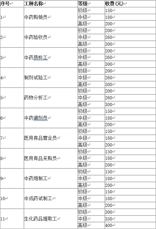 职业技能鉴定收费标准一览表