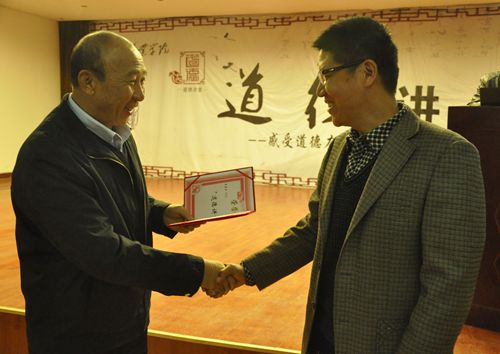 图为“送吉祥祝福”环节,尹士优副书记向主讲人颁发“道德讲堂贡献奖”荣誉证书