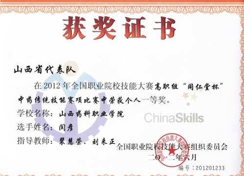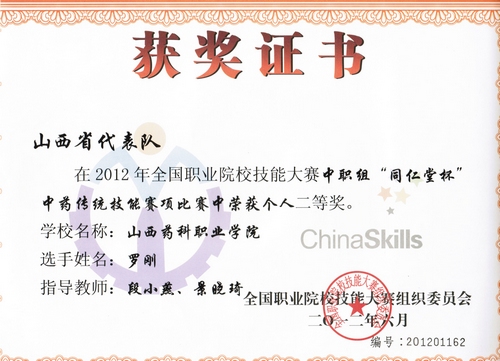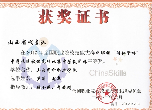 由国家教育部、国家中医药管理局联合举办的2012年全国职业院校技能大赛----“同仁堂杯”中药传统技能大赛于6月14日在山东中医药高等专科学校落下帷幕,AG电子官网参赛选手表现不俗,喜获佳绩,取得历史性突破:荣获高职组团体一等奖、中职组团体三等奖;闫彦、范玉琴两名同学双双捧得高职组个人一等奖,罗刚同学荣获中职组个人二等奖;裴慧荣、刘来正两名教师分获优秀指导教师奖。