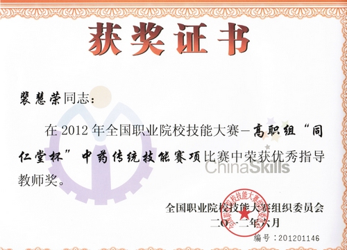 据悉,全国职业院校技能大赛是从2008年开始由教育部发起,联合有关部门、行业和地方共同举办的一项全国性职业教育学生竞赛活动。中药传统技能大赛今年首次纳入该项赛事,其目的是检验中医药职业院校专业建设和教学改革的成果,充分展示各参赛院校学生的岗位通用技术、综合职业能力与团队协作精神。本次技能大赛分设中职组和高职组两个组别,设有中药性状鉴别、中药真伪鉴别、中药调剂与中药炮制四个比赛项目,共有来自全国27个省市自治区的66所职业院校,计132名选手参赛。经过为期两天的激烈角逐,4所高职院校和3所中职学校荣获团体总分一等奖,7名高职组选手和6名中职组选手分别荣获个人总分一等奖。