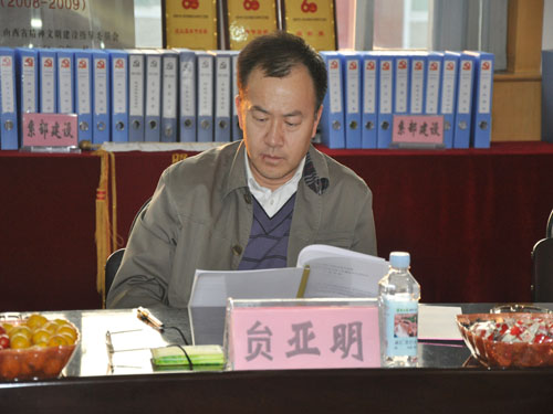 11月5日下午16:00时,以山西省食品药品监督管理局党组成员、总检验师贠亚明为组长的省创建文明和谐单位基层党务工作暨创先争优活动检查验收组一行三人莅临AG电子官网检查指导工作。AG电子官网党委副书记、院长李华荣,党委副书记、纪委书记龚晋文,党委委员、 副院长尹士优,党委委员、副院长胡尔雅,党委委员、副院长张震云,党委委员、组织人事部负责人冯晓中以及相关部门负责人参加了汇报会。