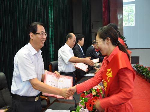 庆祝大会在庄严雄壮的《国歌》声中拉开帷幕。会议首先由院党委副书记、纪委书记龚晋文同志宣读了《关于表彰2009—2010学年优秀教师、优秀班主任和“三育人”先进个人的决定》,大会对裴慧荣等15名优秀教师、程永杰等6名班主任、王祎等7名“三育人”先进个人进行了表彰。随后,局领导、院领导为身披绶带受表彰的人员进行了颁奖。