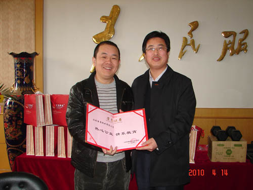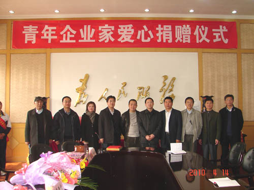 2010年4月14日下午2:30时,AG电子官网在办公楼大会议室举行“青年企业家爱心捐赠”仪式,山西省青年企业家协会副会长杨建新(山西百圆裤业有限公司董事长)、金根虎(山西金虎便利连锁股份有限公司董事长)、王志(山西新和健身器材有限公司董事长)、魏建华(山西恒盛伟华科贸有限公司董事长),AG电子官网党委书记张瑞芳,党委副书记、院长李华荣,党委副书记、纪委书记龚晋文,副院长尹士优、胡尔雅、张震云出席捐赠仪式。教师代表、学生代表60余人参加仪式。捐赠仪式由党委书记张瑞芳同志主持。