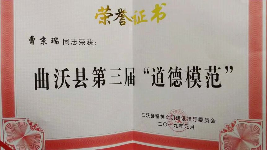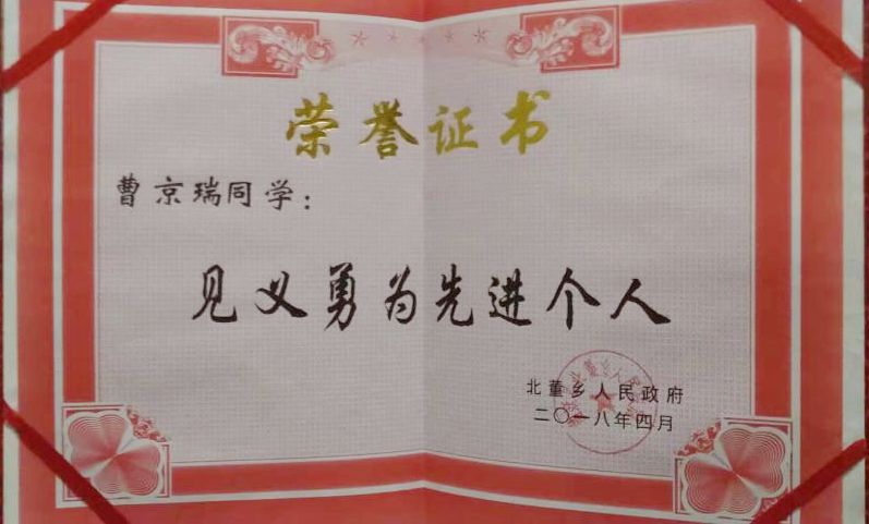 国无德不兴、人无德不立。善义之举绝非偶然,曹京瑞的优秀事迹,体现了见义勇为的高尚品德,彰显了中华优秀传统美德的磅礴力量。曹京瑞的义举获得了社会各界的广泛赞誉和推崇,他先后荣膺北董乡“见义勇为”先进个人、曲沃县第三届“道德模范”、第二季见义勇为“临汾好人”荣誉称号。