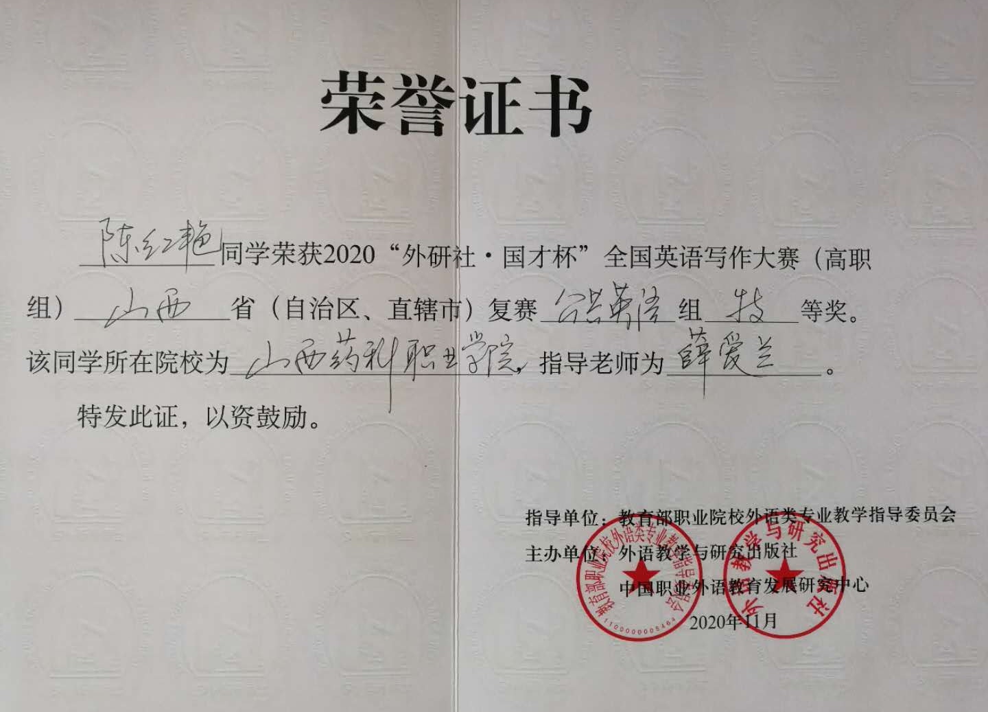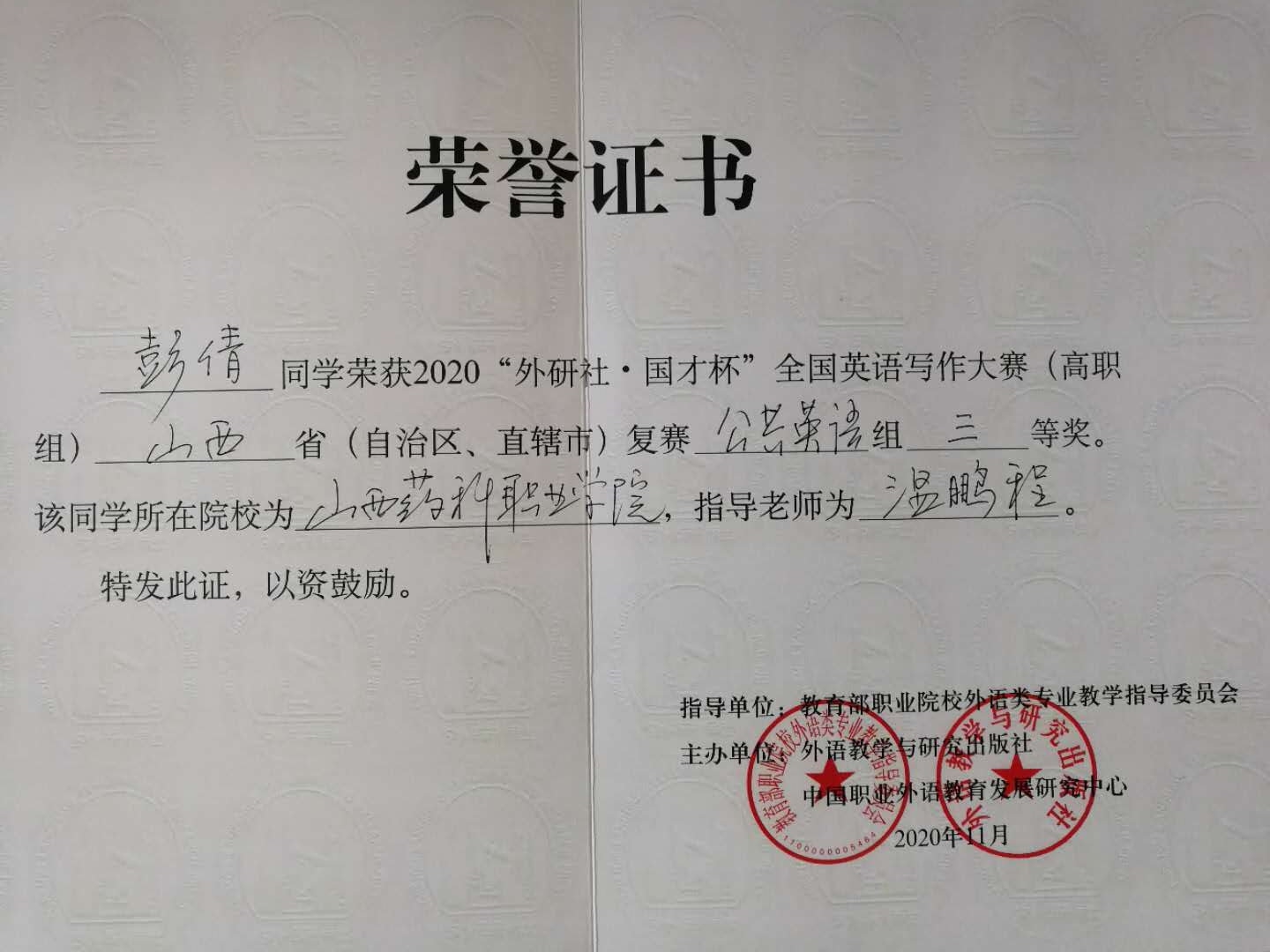 近日,2020“外研社∙国才杯”全国英语写作大赛(高职组)山西省复赛刚刚落下帷幕,由基础部薛爱兰老师指导的陈红艳同学荣获特等奖,温鹏程老师指导的彭倩同学荣获三等奖。