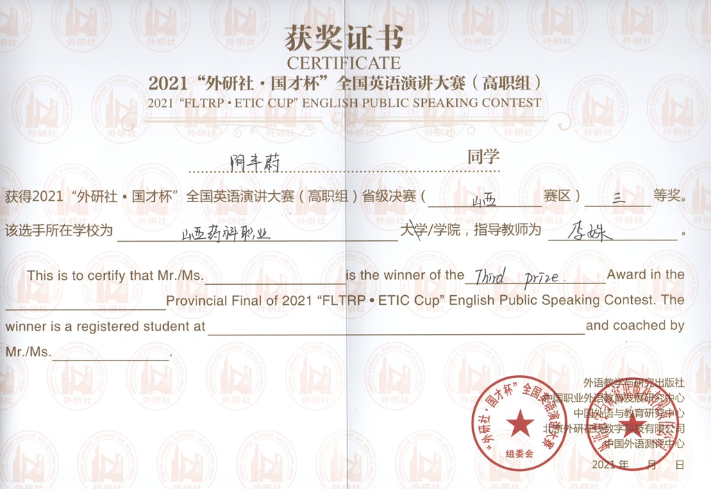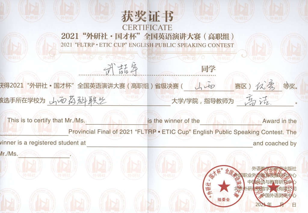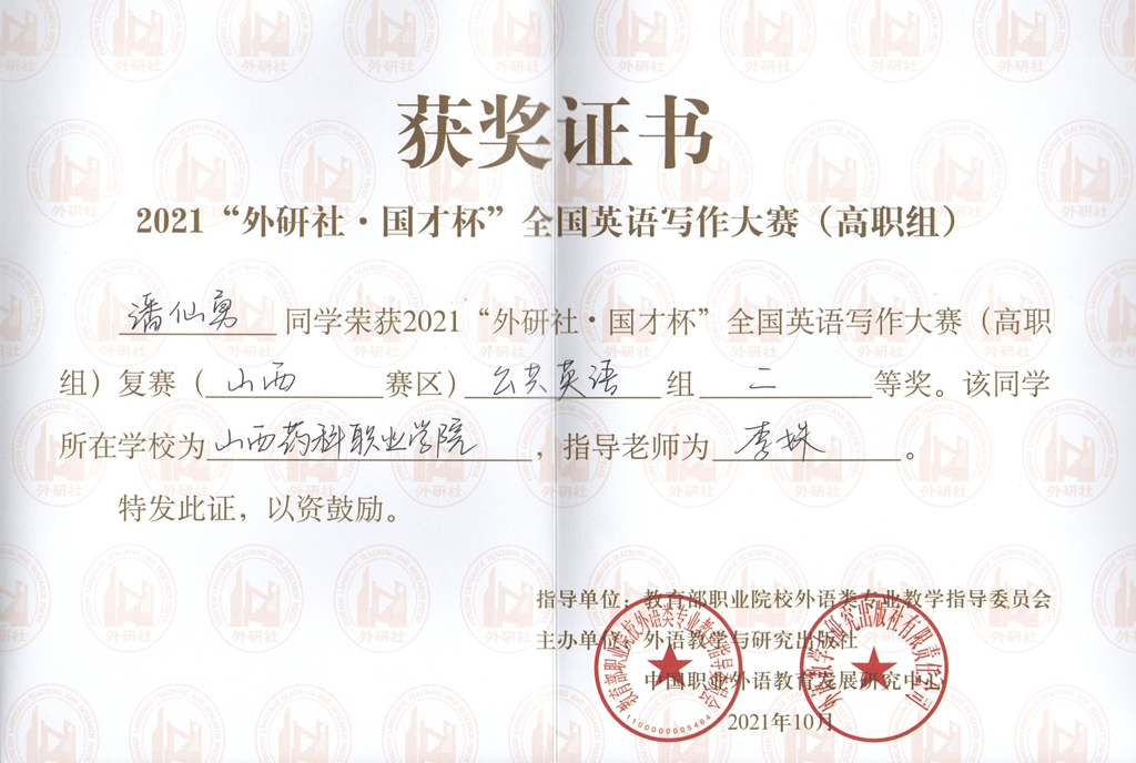 金秋十月,喜报频传。近日,2021 “外研社 ∙ 国才杯”全国英语写作大赛(高职组)、演讲大赛(高职组)山西省决赛圆满落下帷幕,由基础部教师李姝指导的学生潘仙勇荣获写作比赛二等奖,阴丰蔚荣获演讲比赛三等奖;教师高洁指导的学生申朵荣获写作比赛三等奖,武喆宇荣获演讲比赛优秀奖。