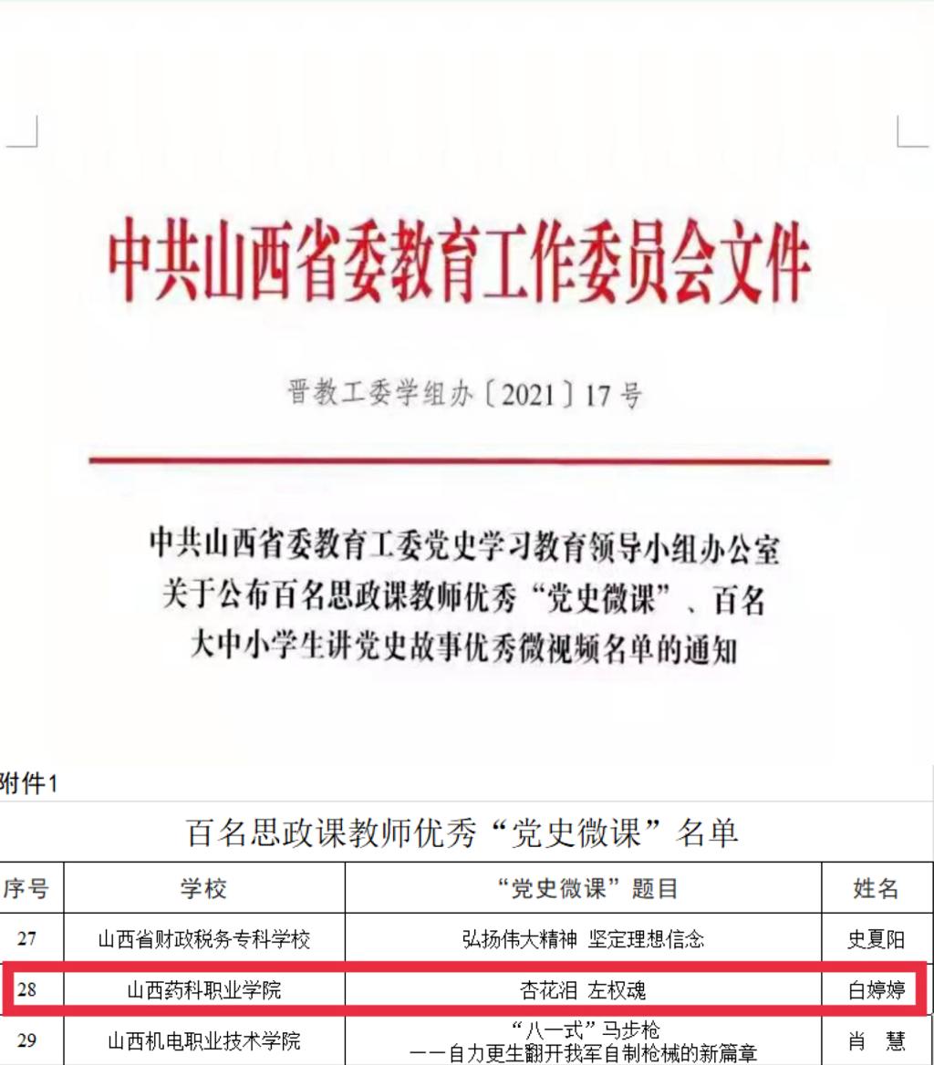 日前,省教育厅以及省委教育工委党史学习教育办公室分别公布了2021年度山西省职业教育教学名师名单和百名思政课教师优秀“党史微课”名单。AG电子官网教师杜月莲获得“2021年度山西省职业教育教学名师”荣誉称号,教师白婷婷主讲的《杏花泪 左权魂》入选百名思政课教师优秀“党史微课”。