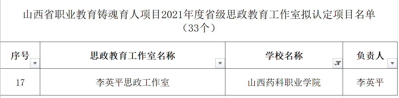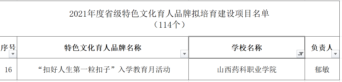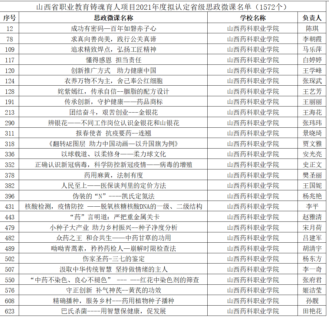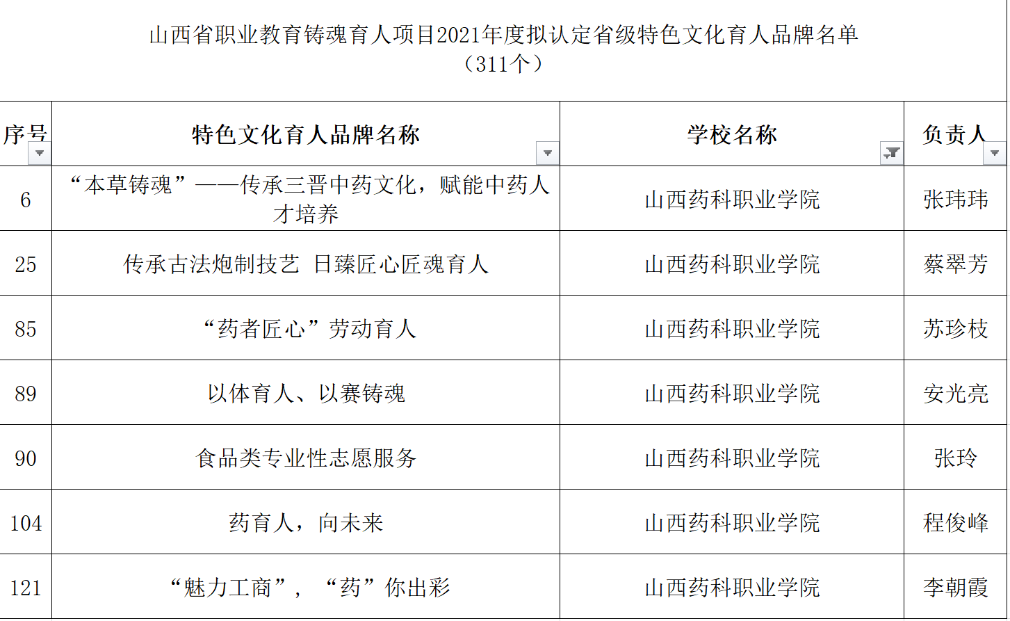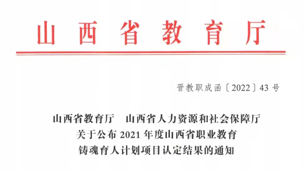 近日,山西省教育厅公布2021年度职业教育铸魂育人计划项目认定结果,AG电子官网铸魂育人“三个一工程”建设喜获佳绩。“李英平思政工作室”被认定为省级职业教育思政教育工作室, “‘本草铸魂’——传承三晋中药文化,赋能中药人才培养”等7个项目被认定为省级职业教育特色文化育人品牌,《成功有密码—百年如磐赤子心》等28个微课被认定为省级职业教育思政微课,“‘扣好人生第一粒扣子’入学教育月活动”被认定为省级特色文化育人品牌培育建设项目。