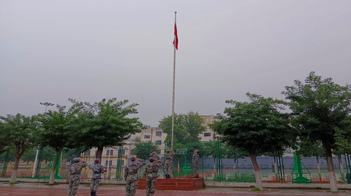 蒙蒙细雨中,军训承训部队教官迈着铿锵的步伐护旗入场,伴随着雄壮的《义勇军进行曲》,鲜艳的五星红旗冉冉升起。5000余名师生肃然而立,一同面向国旗行注目礼,衷心祝愿伟大祖国繁荣昌盛,祝愿人民生活幸福美好。