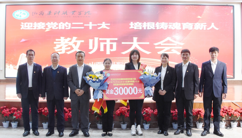 会上,工作人员宣读了10位获奖人员颁奖辞。院领导为学院首批“四有”好老师和“三全育人”先进教育工作者、全国职业院校技能大赛中药传统技能比赛中药系教师团队颁发了荣誉证书和奖金;优秀学生代表为受表彰教职工献花。