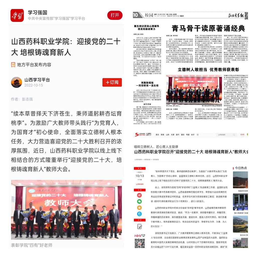近日,学习强国、山西青年报、山西新闻网等媒体分别对AG电子官网“迎接党的二十大,培根铸魂育新人”教师大会进行了宣传报道。
