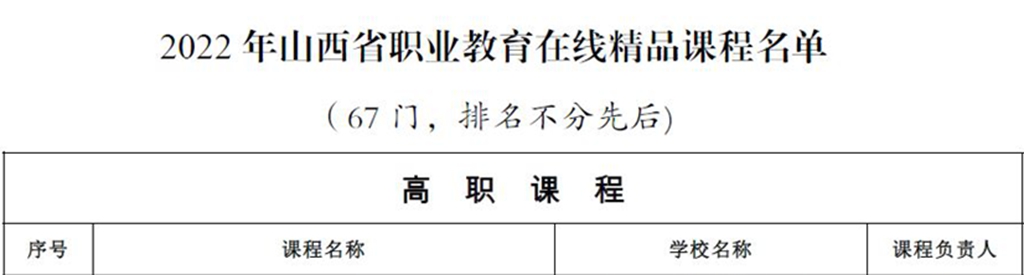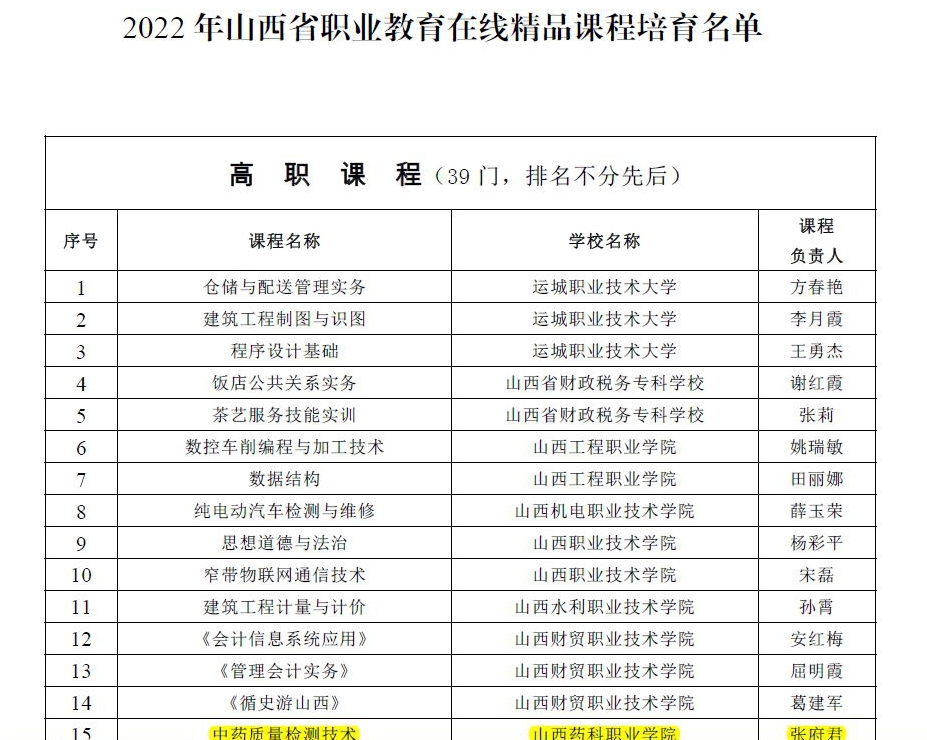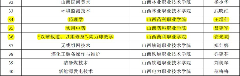 近日,山西省教育厅发布《关于公布2022年山西省职业教育在线精品课程认定结果的通知》,认定山西工程科技职业大学《会计基础》等67门课程为2022年山西省职业教育在线精品课程,并将39门课程纳入省级在线精品课程培育建设名单。其中,AG电子官网中药系吕建军老师主持的《实用中药》、药学系王增仙老师主持的《药理学》和公共体育教学部安光亮老师主持的《“以球载道、以柔修身”--柔力球教学》三门课程被认定为山西省2022年职业教育在线精品课程;中药系张府君老师主持的《中药质量检测技术》课程被纳入省级在线精品课程培育建设名单;《中药鉴定技术》和《药理学》2门课程推荐申报国家级在线精品课程。