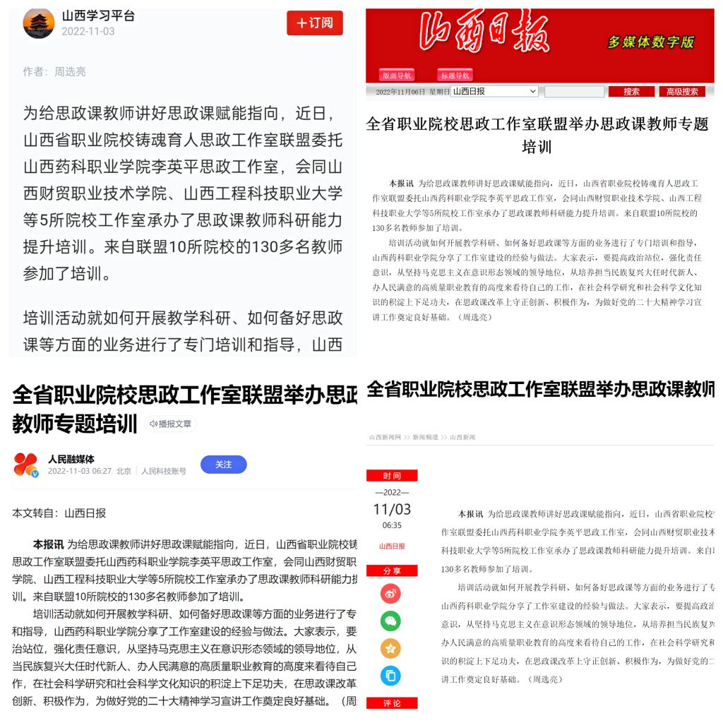 11月3日,学习强国、山西日报、人民融媒体、山西新闻网等媒体平台对全省职业院校思政工作室联盟举办的思政教师专题培训进行了宣传报道。