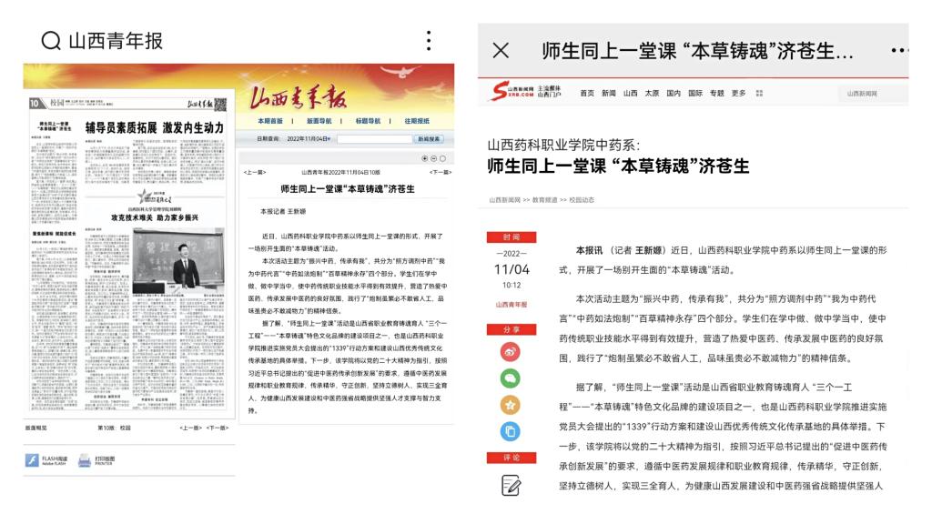 11月4日,山西青年报、山西新闻网等媒体平台对AG电子官网师生同上一堂课“本草铸魂”济苍生活动进行了宣传报道。