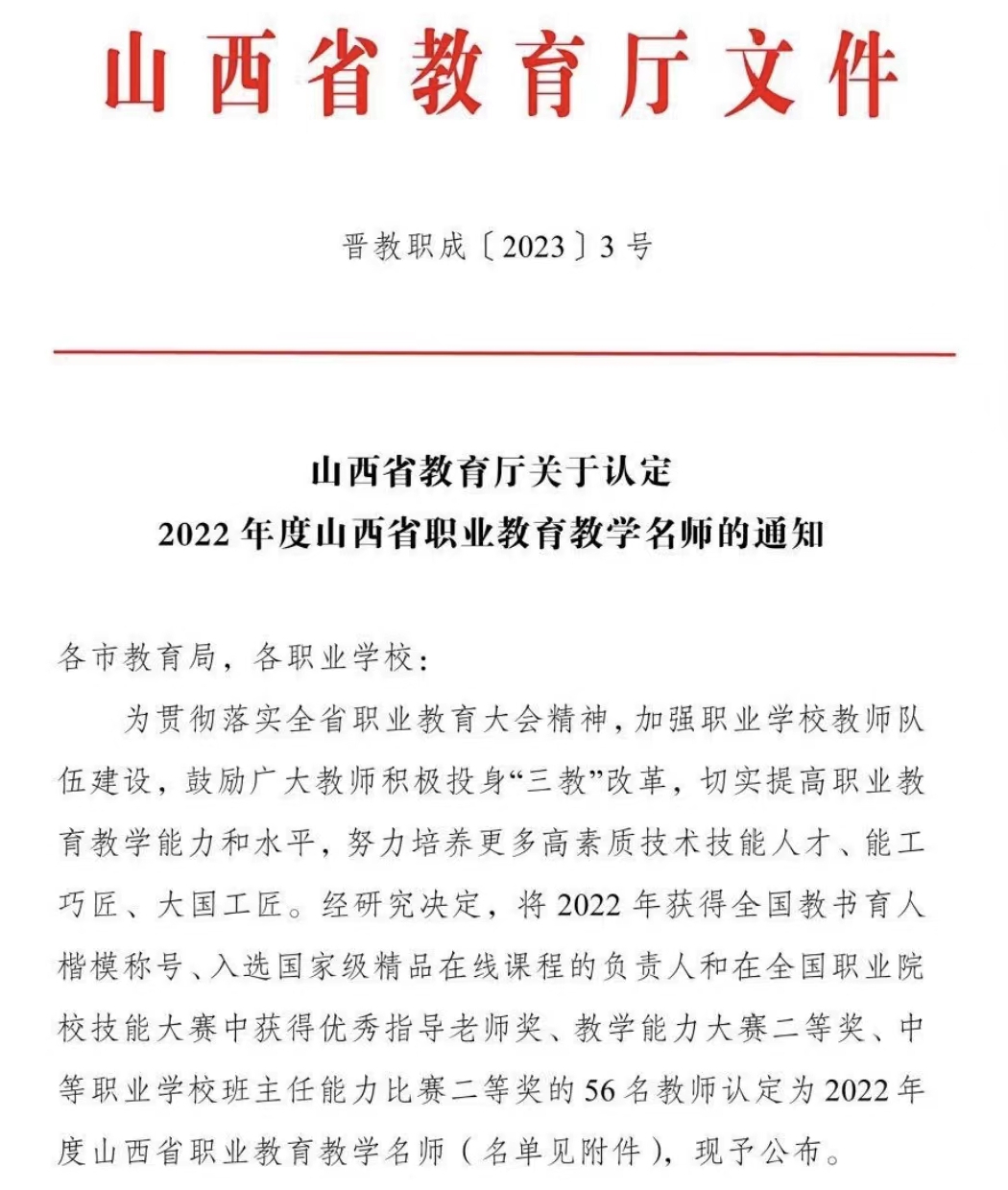 2月21日,山西省教育厅发布了2022年度山西省职业教育教学名师名单,AG电子官网中药系教师张玮玮副教授位列其中。