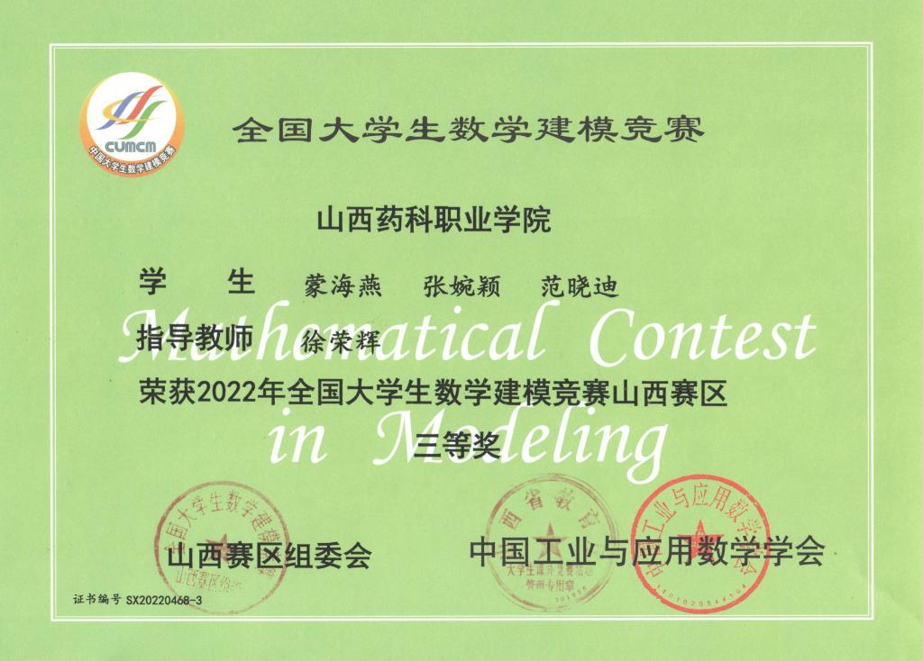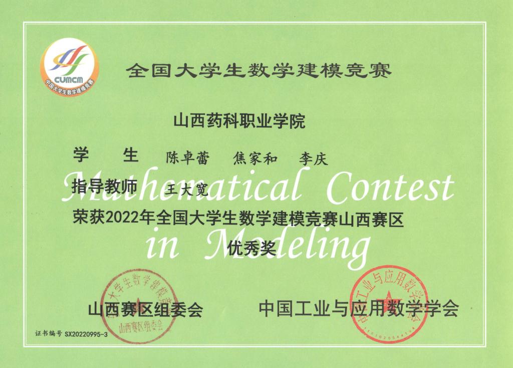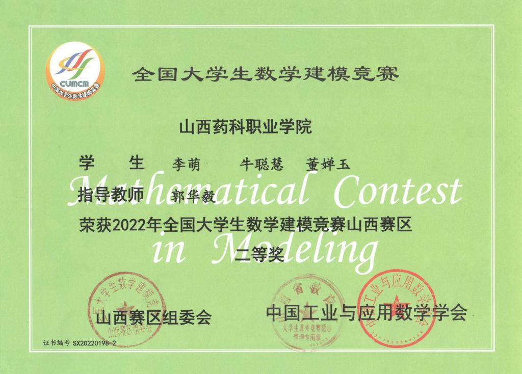 近日,2022年全国大学生数学建模竞赛山西赛区颁奖仪式在山西财政税务专科学校进行,AG电子官网学生在此次比赛中取得优异成绩。其中李萌、牛聪慧、董婵玉荣获山西赛区二等奖,蒙海燕、张婉颖、范晓迪荣获山西赛区三等奖,陈卓蕾、焦家和、李庆荣获优秀奖。