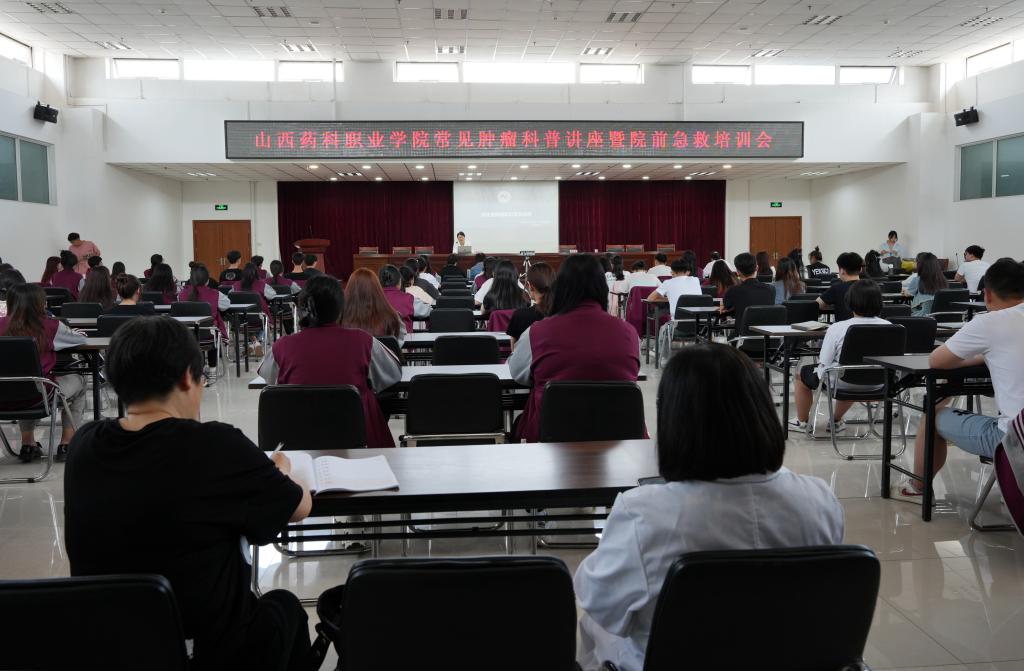 在2023年职业教育活动周全面开启之际,为丰富职业教育周活动内容,提升学生急救技能,加深师生对“常见肿瘤科”以及“院前急救”的认识与了解,5月17日下午,学院邀请山西医科大学第一附属院肿瘤科副主任、医学博士郭亚荣团队在综合楼527室举行了“常见肿瘤科普讲座暨院前急救”培训会,会议由药学系党总支副书记、主任王玉秀主持。学院100余名师生参加了本次培训。