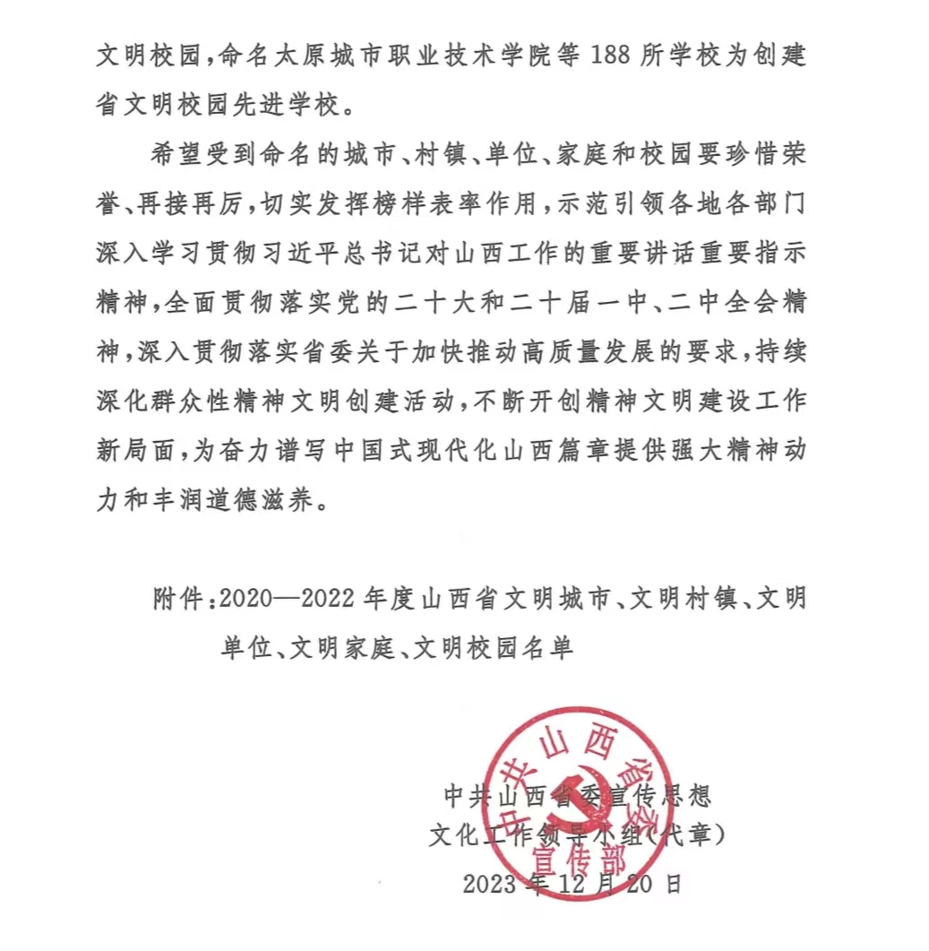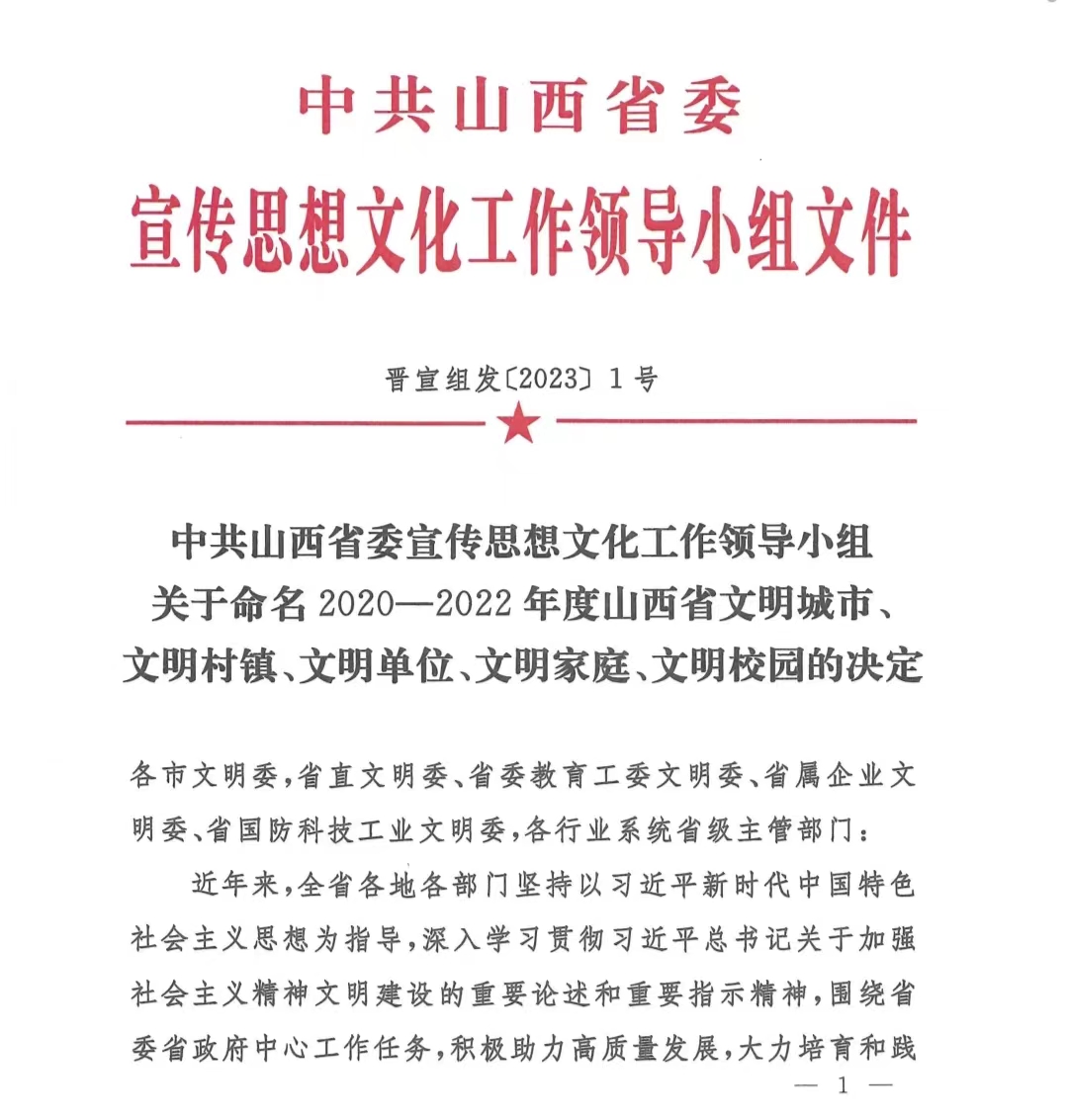 近日,中共山西省委宣传部下发《关于命名2020-2022年度山西省文明城市、文明村镇、文明单位、文明家庭、文明校园的决定》(晋宣组发〔2023〕1号),AG电子官网荣获“山西省文明校园”称号。