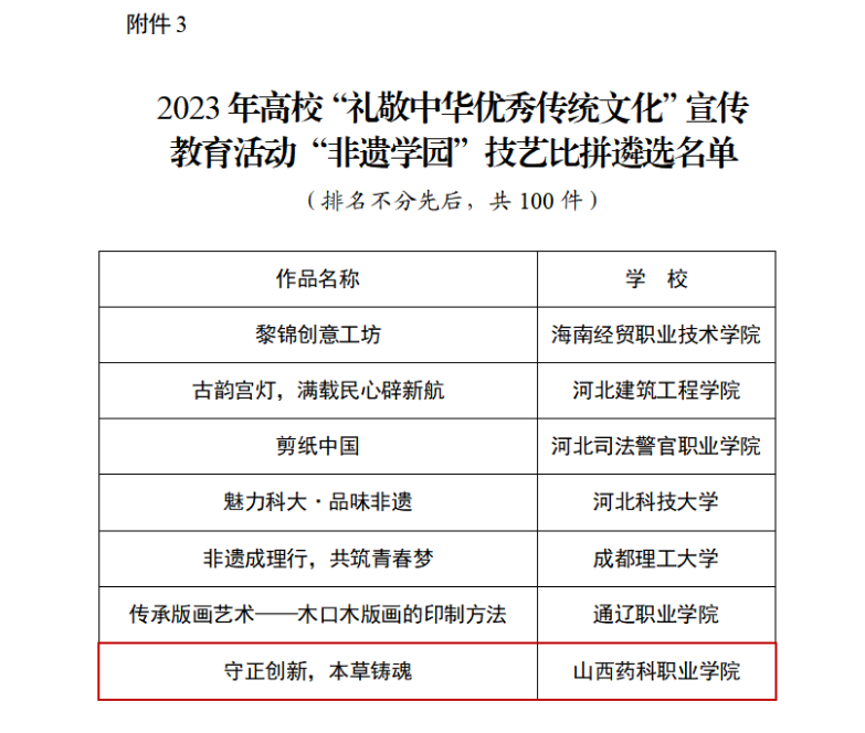 2023年高校“礼敬中华优秀传统文化”宣传教育活动由教育部思想政治工作司主办,以“根植文化沃土汇聚奋进力量”为主题,共评选出“红色家园”“水墨校园”及“非遗学园”三大类优秀作品300件,我省共有5所高校8件作品入选,其中AG电子官网作为全省唯一一所获奖的高职院校名列其中。自该项活动开展以来,学院高度重视,成立了由宣传统战部牵头的工作小组,联动五育实践工作室,广泛发动、精心策划、认真准备,经过校内层层筛选,《守正创新,本草铸魂》作为参评项目推荐上报。《守正创新,本草铸魂》成功入选全国高校“非遗学园”技艺比拼百件作品,充分展示了AG电子官网师生在中药传统技艺方面的扎实功底和精益求精、守正创新的良好职业品质。