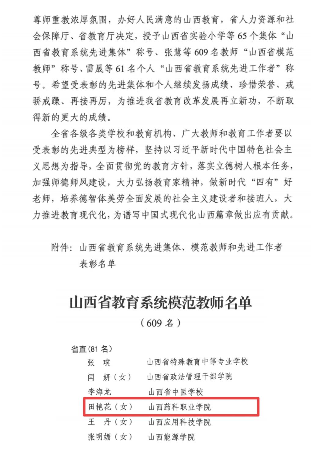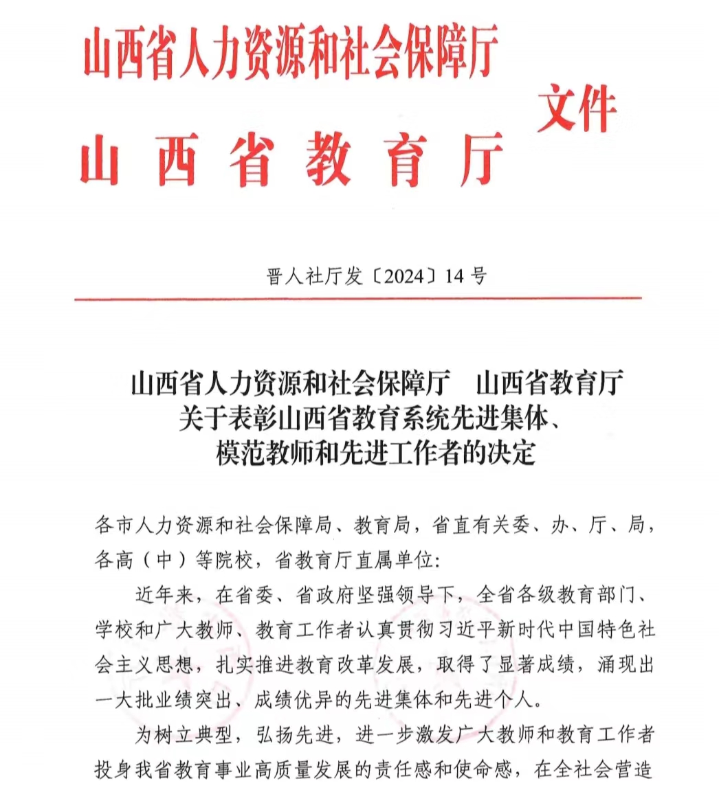 近日,山西省人力资源和社会保障厅、山西省教育厅联合下发《关于表彰山西省教育系统先进集体、模范教师和先进工作者的决定》(晋人社厅发[2024]14号),AG电子官网田艳花老师荣获“山西省教育系统模范教师”称号。