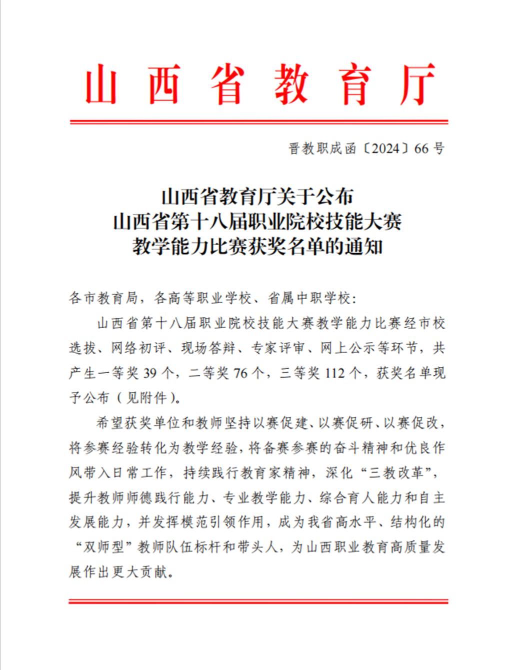9月9日,山西省教育厅公布了山西省第十八届职业院校技能大赛教学能力比赛获奖名单,由AG电子官网教师张府君主持,郎超、张妤、张孟容参与的团队在此次大赛中齐心协力、努力比拼,斩获高职组一等奖。此外,AG电子官网陈湘玲团队、刘文娟团队、王海花团队、杨兆艳团队也不负众望,分别荣获高职组三等奖。