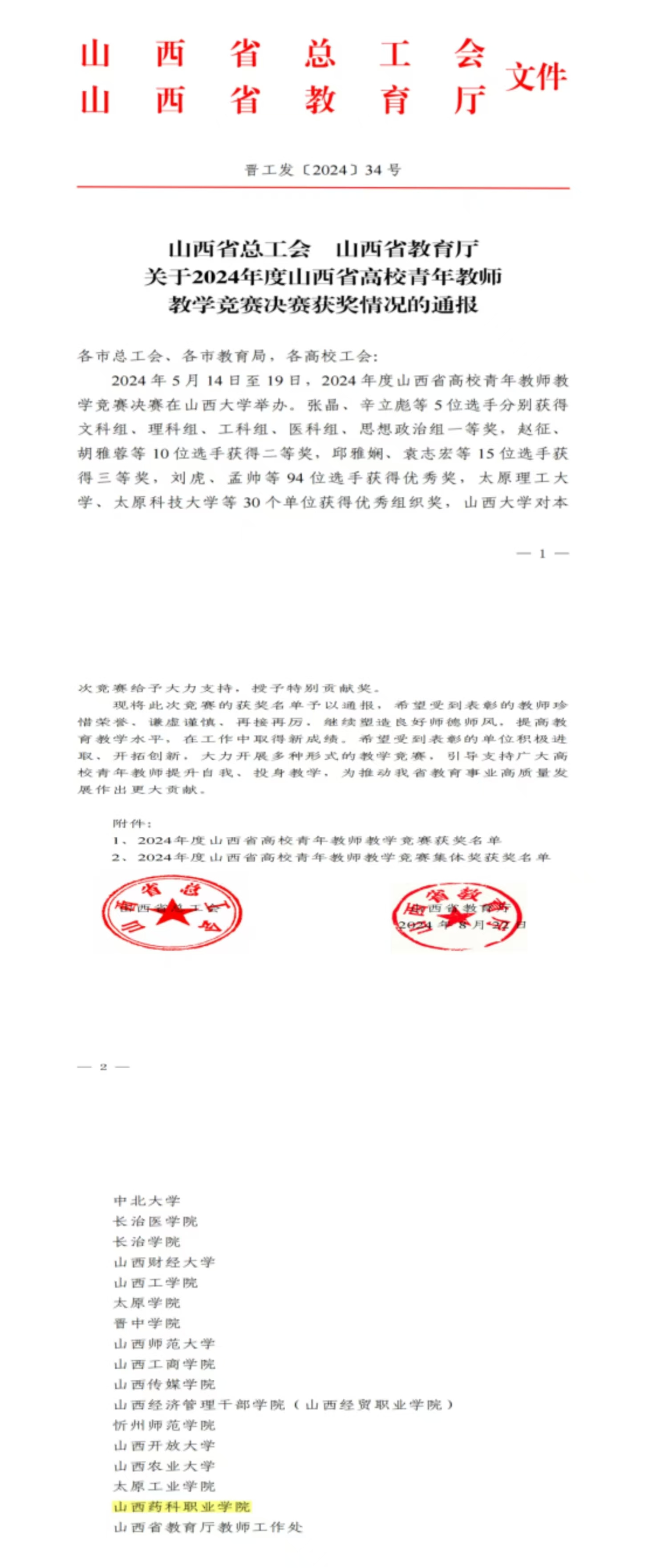 近日,山西省总工会与山西省教育厅共同发布《关于2024年度山西省高校青年教师教学竞赛决赛获奖情况的通报》,AG电子官网荣获优秀组织奖。