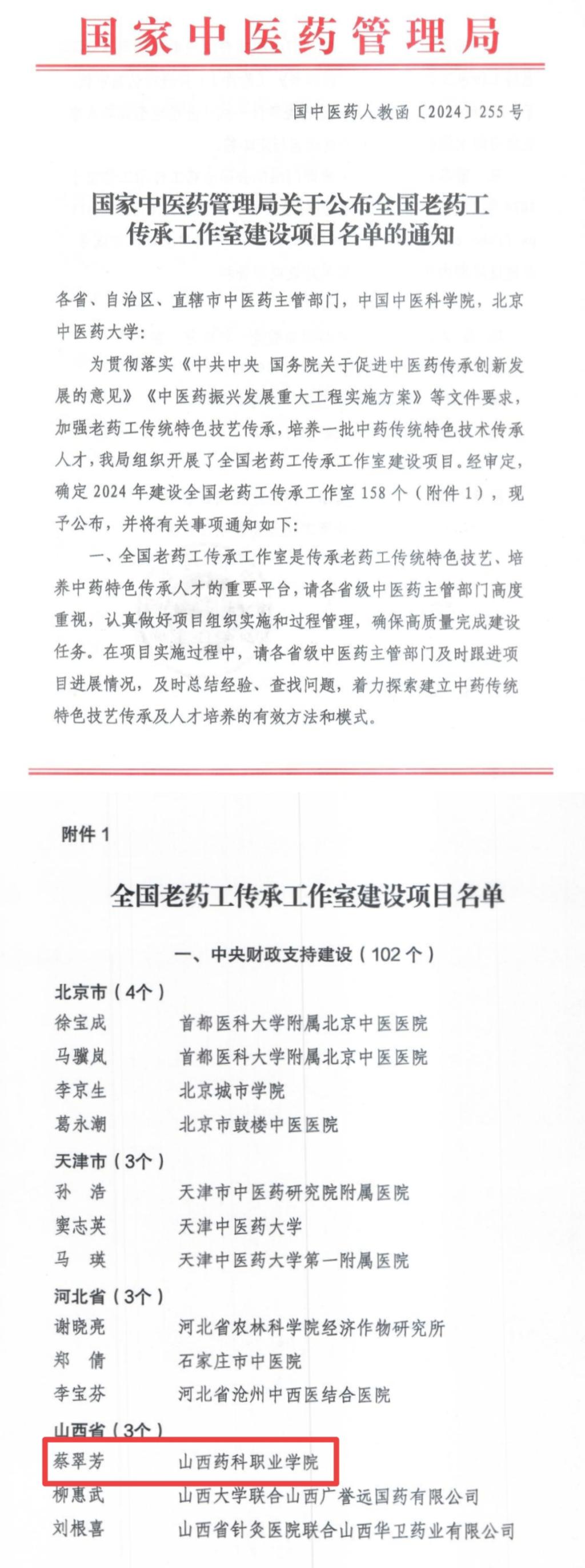 日前,国家中医药管理局公布2024年全国老药工传承工作室建设项目名单,来自全国各省市区共计158个建设项目获批,其中山西省获批3项,AG电子官网“蔡翠芳老药工传承工作室”成功入选。