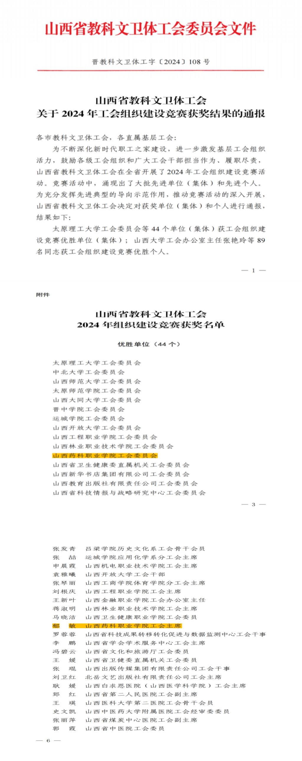 近日,山西省教科文卫体工会公布2024 年工会组织建设竞赛获奖名单,AG电子官网工会喜获“山西省教科文卫体工会2024年工会组织建设竞赛优胜单位(集体)”、工会主席郁敏同志喜获“山西省教科文卫体工会2024年工会组织建设竞赛优胜个人”。
