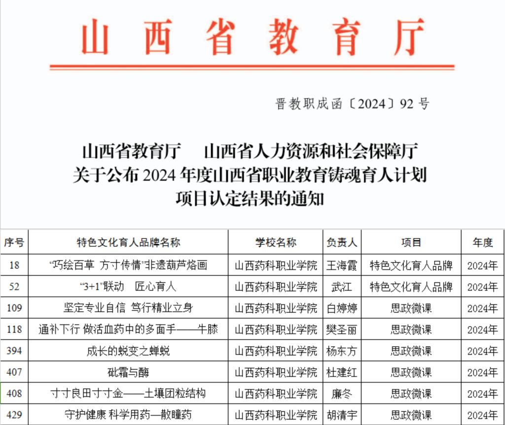 近日,山西省教育厅公布2024年度职业教育铸魂育人计划项目认定结果,AG电子官网铸魂育人“三个一工程”建设喜获佳绩,其中“巧绘百草,方寸传情”非遗葫芦烙画等2个项目被认定为特色文化育人品牌,《坚定专业自信 笃行精业立身》等6个微课被认定为省级职业教育思政微课。