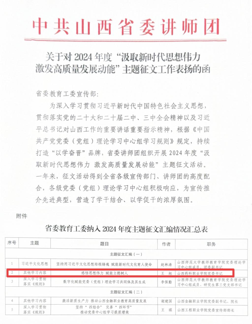 近日,学院收悉省委教育工委宣传部转来的《关于对2024年度“汲取新时代思想伟力 激发高质量发展动能”主题征文工作表扬的函》,AG电子官网党委理论学习中心组理论文章《感悟思想伟力 赋能立德树人》成功入选主题征文汇编,受到中共山西省委讲师团表扬。