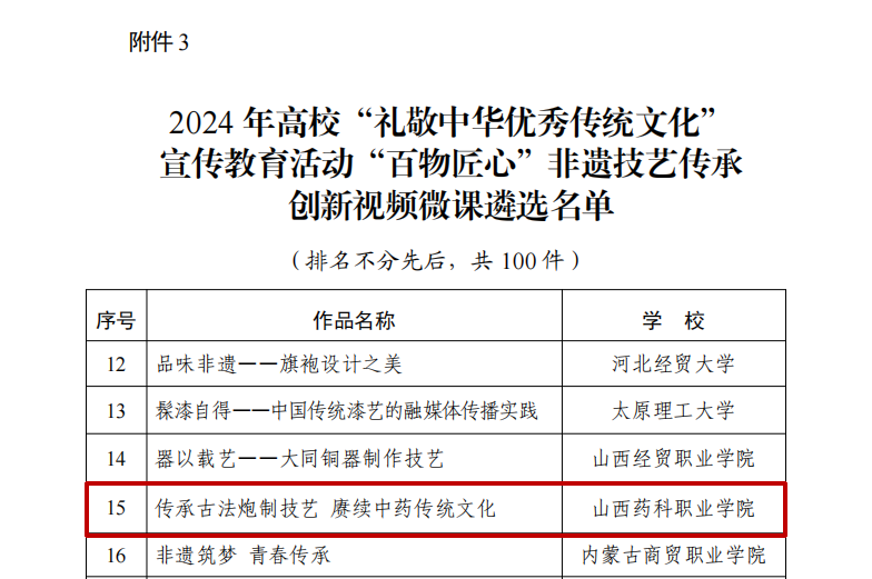 2024年高校“礼敬中华优秀传统文化”宣传教育活动由教育部思想政治工作司主办,以“赓续文化血脉筑牢信仰根基谱写青春华章”为主题,共评选出“创承文脉”高校主题数字微展览联展、“铸魂润心”文化育人创新工作案例及“百物匠心”非遗技艺传承创新视频微课三大类优秀作品各100件,山西省共有5所高校作品入选,其中AG电子官网是唯一一所连续两年参与并获奖的职业院校。自活动开展以来,AG电子官网高度重视,成立了由宣传统战部牵头的工作小组,联动“五育”实践工作室,广泛发动、精心策划、认真准备,经过校内层层筛选,《传承古法炮制技艺 赓续中药传统文化》作为参评作品推荐上报,该作品聚焦于中药炮制技艺这一非物质文化遗产,通过视频微课的形式,生动展现了丸药、线香、倒流香、香囊等中药文化产品制作技艺的历史渊源、技艺流程和文化内涵,同时也彰显了学院在中药学领域的深厚底蕴以及传承和弘扬中华优秀传统文化的使命担当。