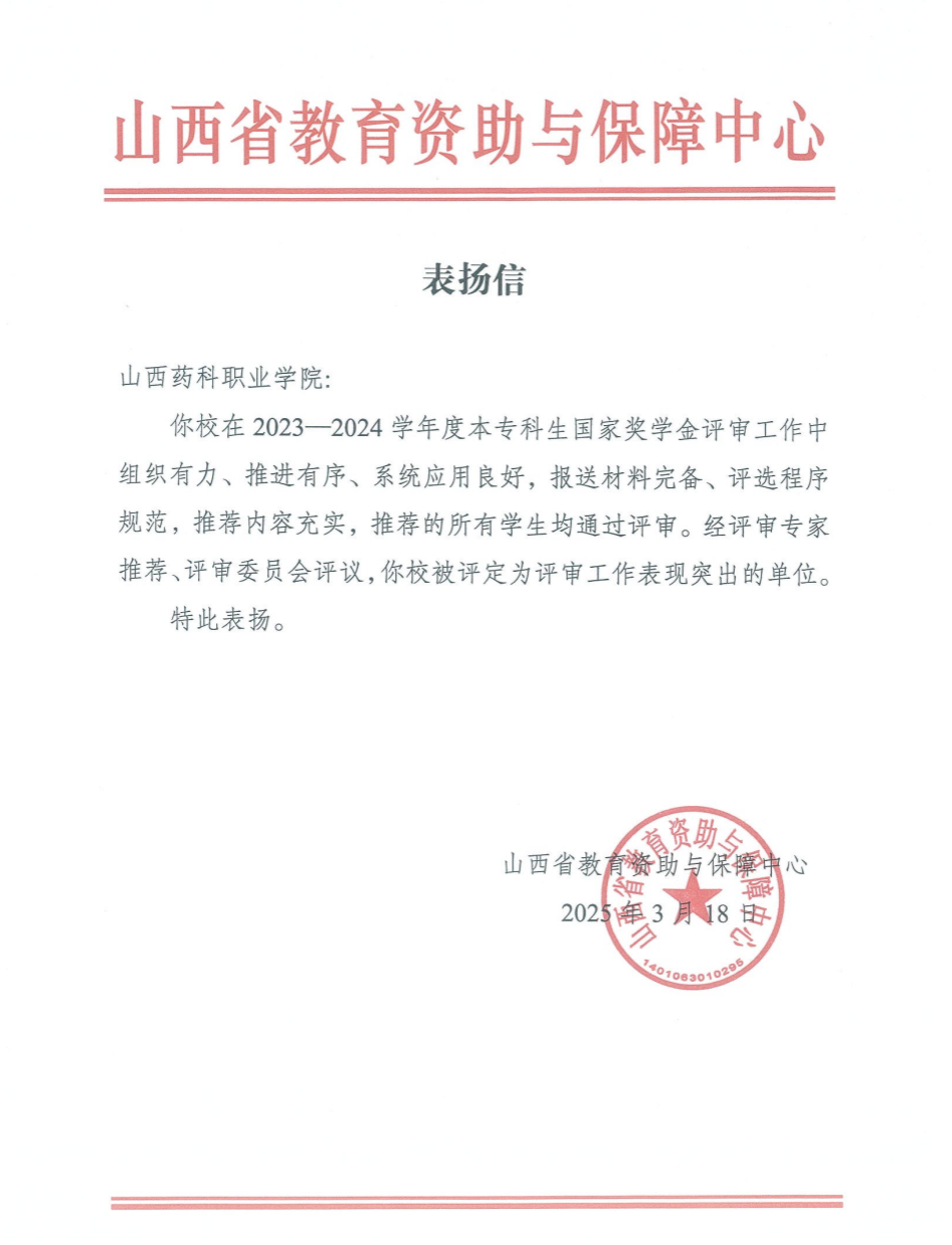 近日,山西省教育资助与保障中心向AG电子官网发来表扬信,对AG电子官网学生国家奖学金评审工作给予高度肯定。信中指出:你校在2023-2024 学年度本专科生国家奖学金评审工作中组织有力、推进有序、系统应用良好,报送材料完备、评选程序规范,推荐内容充实,推荐的所有学生均通过评审。经评审专家推荐、评审委员会评议,你校被评定为评审工作表现突出的单位。