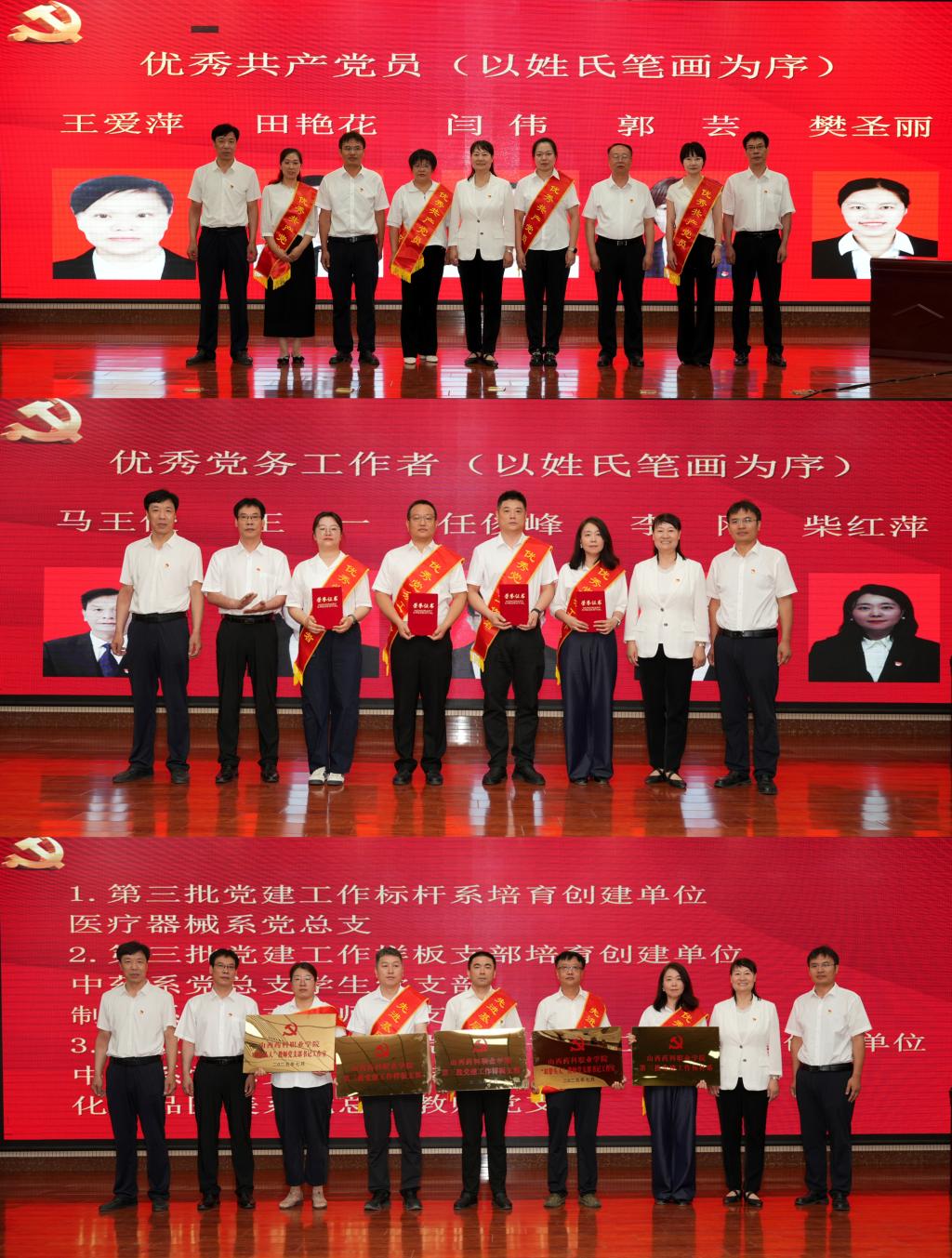 会议表彰了5名优秀共产党员和5名优秀党务工作者,为学院第三批党建工作标杆系培育创建单位医疗器械系党总支、样板支部培育创建单位中药系党总支学生党支部和制药系党总支教师党支部、“双带头人”教师党支部书记工作室培育创建单位中药系党总支教师党支部和化妆品医美系党总支教师党支部分别授牌。