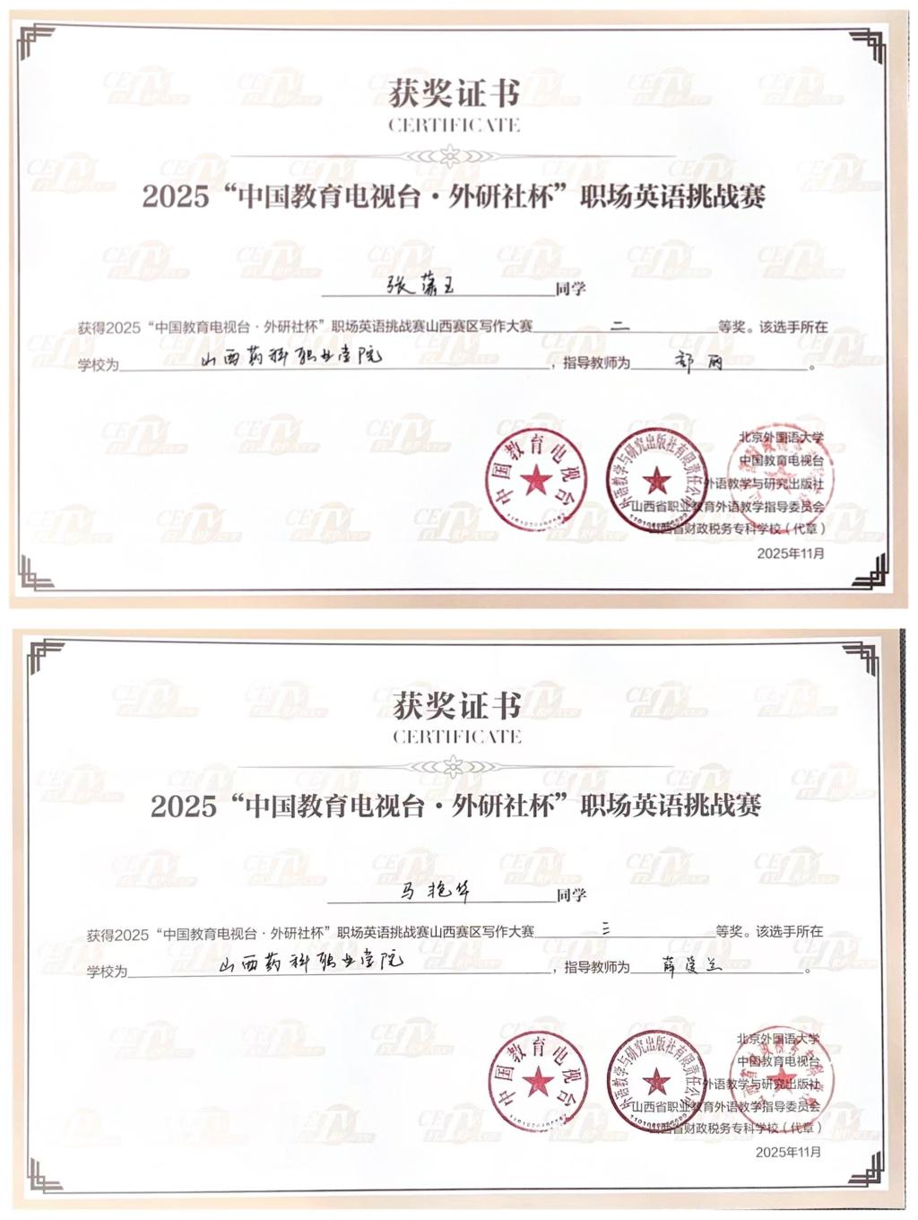 11月2日,2025年“中国教育电视台·外研社杯”职场英语挑战赛写作大赛山西省赛圆满落幕。AG电子官网学子凭借扎实的英语功底与出色的职场应用能力脱颖而出,2024级药学1班学生张潇玉荣获二等奖,2024级中药学1班学生马艳华荣获三等奖。