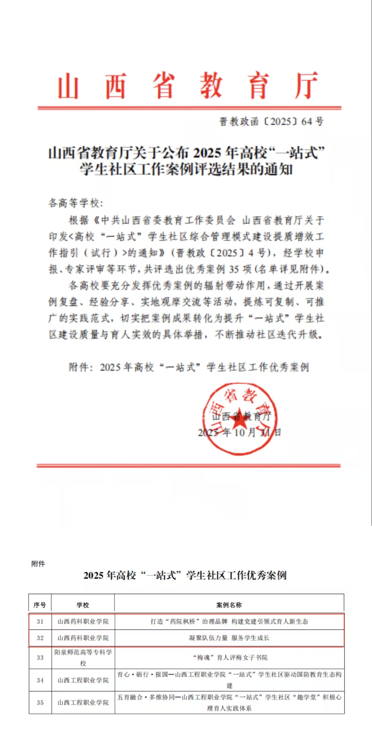 近日,山西省教育厅公布2025年度高校“一站式”学生社区工作案例评选结果,AG电子官网申报的《打造“药院枫桥”治理品牌 构建党建引领式育人新生态》与《凝聚队伍力量 服务学生成长》两项案例成功入选。