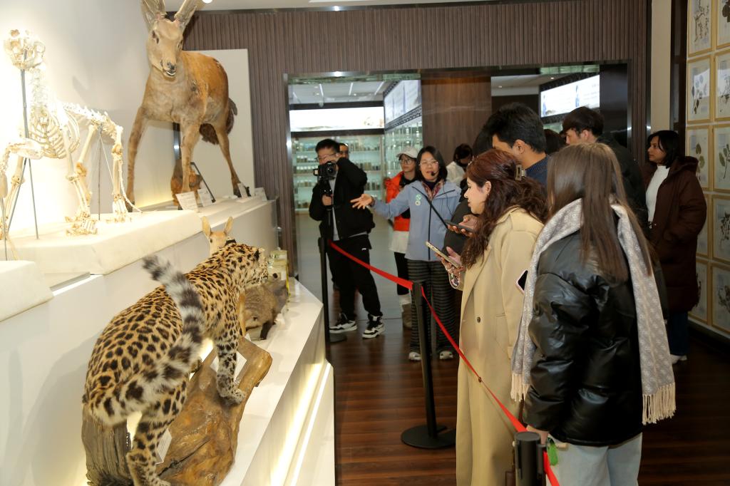 在中药标本馆,丰富的药材陈列引发留学生浓厚兴趣,大家围绕药材特性与药用价值与教师展开热烈交流。