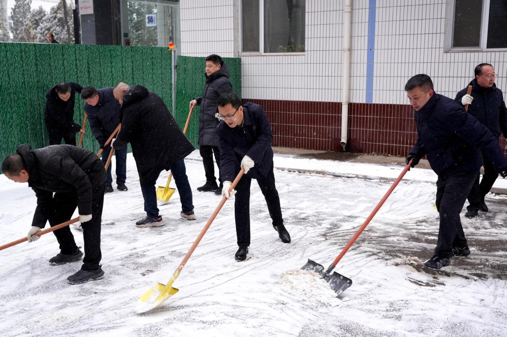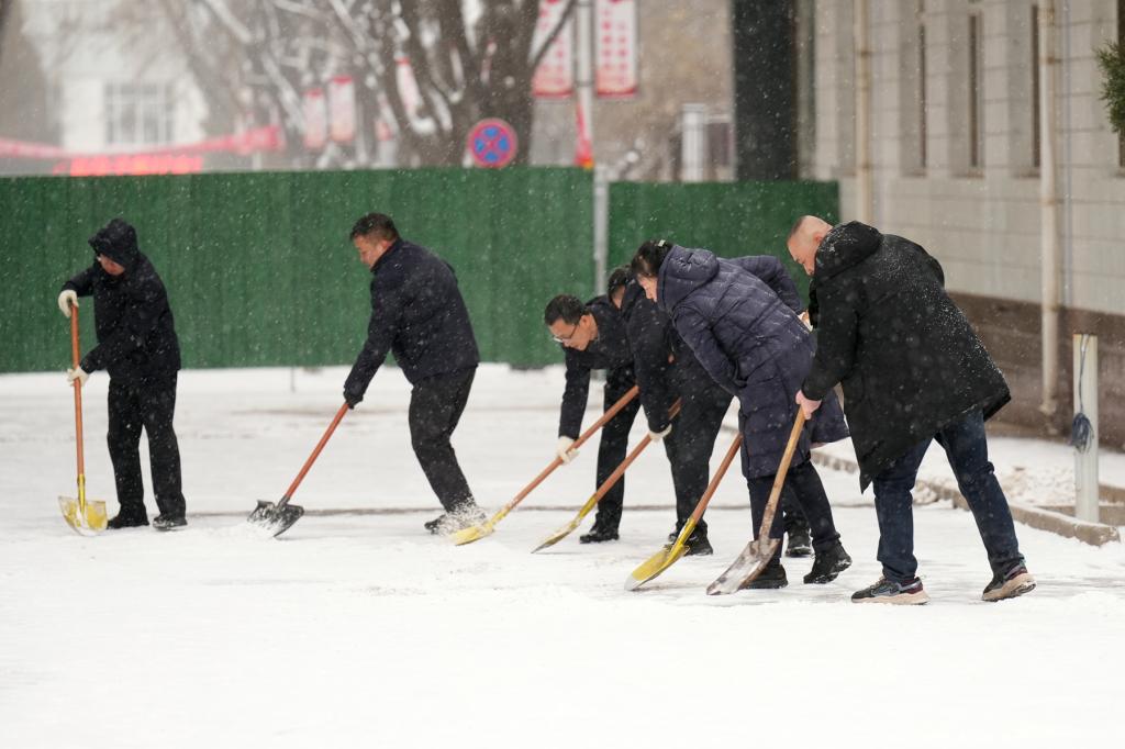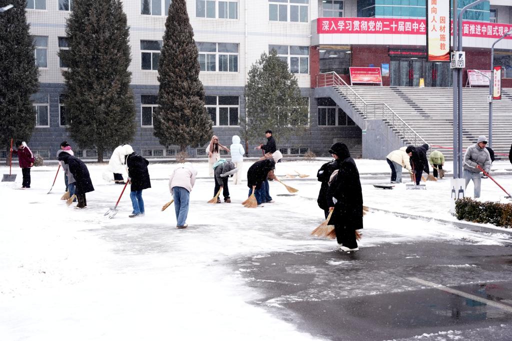 党委书记张轩萍、院长关伟率先抵达清雪区域,带领教职工对教学楼、办公楼周边、主干道及生活区通道等重点区域展开集中清扫。尽管雪花不断、气温降至冰点以下,全体人员仍热情高涨,采取“边下边清、随下随扫”的策略协同作业,铁锹铲雪、扫帚清扫、融雪盐除冰……各类工具与物资轮番上阵,现场井然有序。经过数小时奋战,校园内所有人行干道、台阶坡道的积雪暗冰被彻底清除,三条安全通道全面贯通。