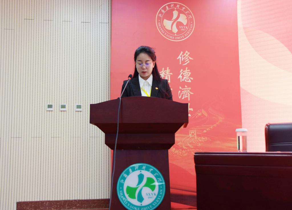 药学系党总支副书记、分工会主席方育婧代表学院工会、妇女联合会、科学技术协会向大会致贺信,对大会的召开表示热烈祝贺,对学院共青团和学生会组织在思想引领、成长服务、桥梁纽带等方面发挥的积极作用给予高度评价,并表达了未来进一步加强协作、共同服务师生和学院发展的美好愿景。