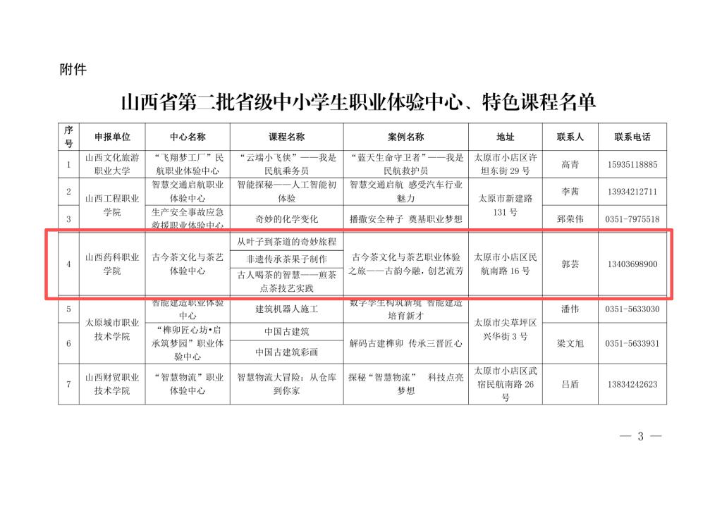 近日,山西省教育厅公布了第二批省级中小学生职业体验中心、特色课程和优秀案例名单,AG电子官网食品系申报的“药·茶技能技艺传承与创新实训基地”成功入选。其中,“古今茶文化与茶艺体验中心”获批省级职业体验中心,3门课程获评省级特色课程,1项成果入选省级优秀案例,标志着食品系在茶文化传承、技能育人与职业体验建设方面取得重要阶段性成果。