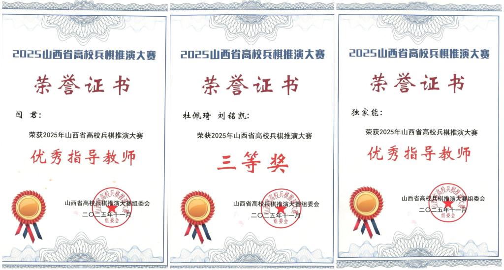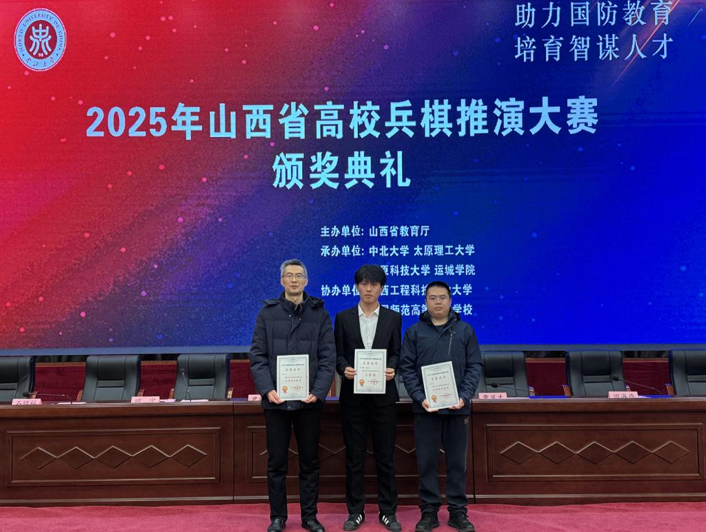 12月30日,2025年山西省高校兵棋推演大赛颁奖典礼在中北大学举行,AG电子官网选派的学生代表队凭借出色表现,荣获大赛三等奖,指导教师闫君、独家能获评“优秀指导教师”称号。