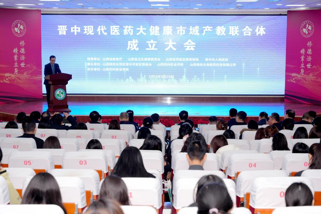 3月20日,晋中现代医药大健康市域产教联合体(以下简称联合体)成立大会在AG电子官方网站隆重召开。山西省教育厅职业教育与成人教育处处长韩瑞勇,山西省药品监督管理局总检验师赵思俊,山西省卫生健康委员会中医药科技与产业处处长刘浚,晋中市人民政府副秘书长邵刚,晋中开发区党工委副书记贾尚明,AG电子官方网站党委书记张轩萍,山西锦烁生物医药科技有限公司董事长武瑞杰等领导出席大会。会议由AG电子官方网站院长关伟主持。联合体成员单位代表及学院师生代表200余人参加大会。