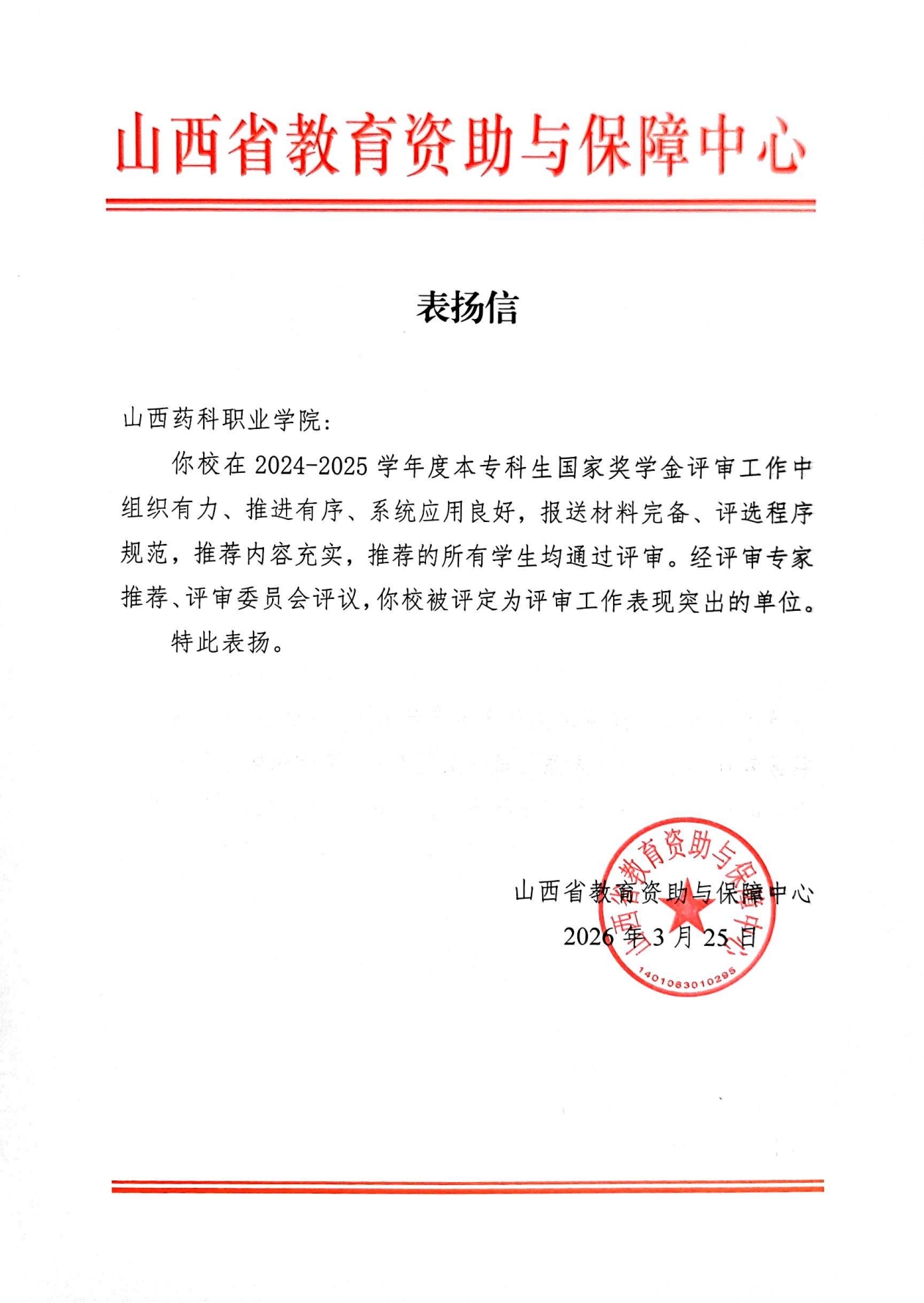 近日,山西省教育资助与保障中心发来表扬信,对AG电子官网2024-2025学年度本专科生国家奖学金评审工作给予高度肯定和通报表扬,AG电子官网被评定为“评审工作表现突出的单位”。
