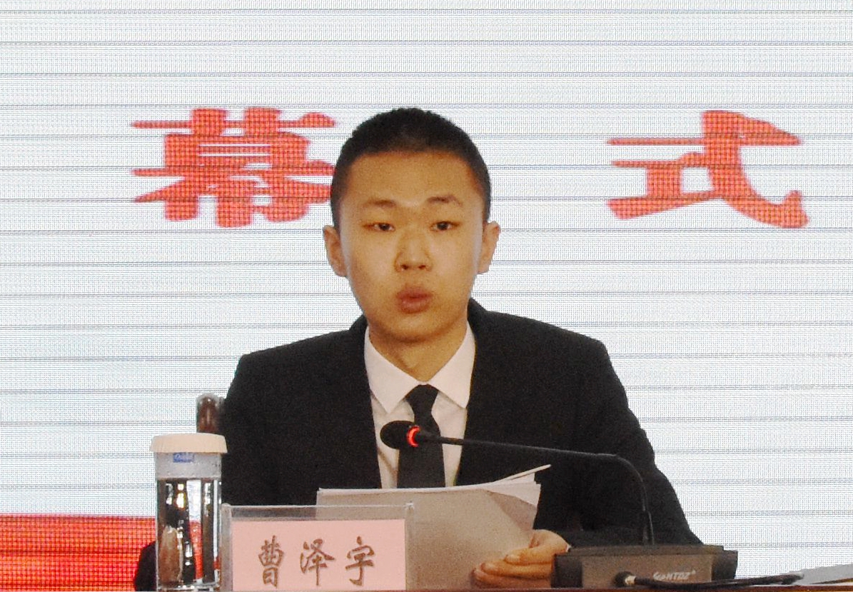 学生曹泽宇代表学院第四届学生委员会向大会作了题为《奋楫争先,勇毅笃行,为学院高质量发展汇聚奋进力量,让青春在不懈奋斗中绽放绚丽之花》的工作报告。