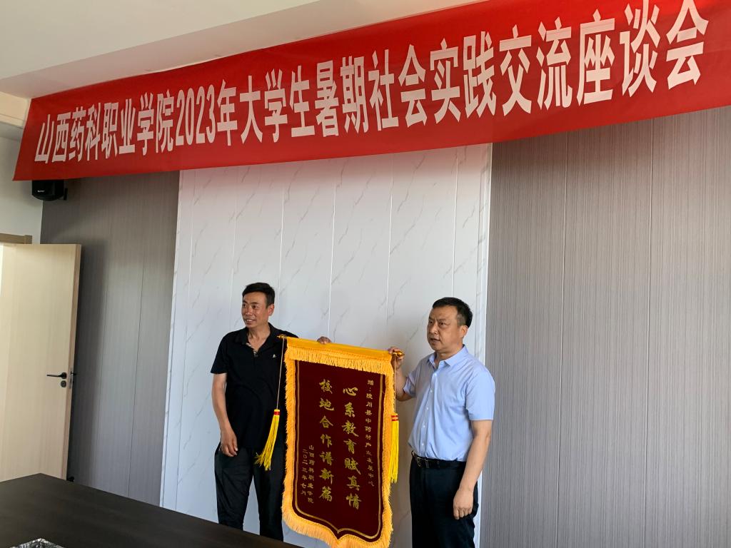 王旭真诚感谢陵川县委、县政府对学院各项工作的大力支持,并向陵川县中药材产业发展中心赠送锦旗。他表示,学院要以此次实践活动为契机,进一步深入推动校、地、企合作,相关专业老师要立足现代中药科技前沿,以高新技术企业为平台,以项目为导向,在科研成果的转化上下功夫,为企业发展赋能增智。要与地方、企业建立实践、实习、教学、科研全方位的合作关系,打造产学研训一体化基地,实现共建共享、偕同发展。他鼓励同学们要珍惜宝贵机会,边实践边学习边总结,在学习实践中经风雨、见世面、壮筋骨、长才干,在青春的赛道上奋力跑出山西药科青年最好的成绩。