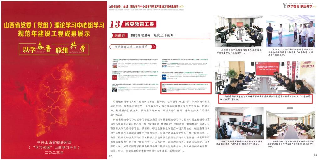 近日,山西省委宣传部印发“以学奋晋 联组共学”——山西省党委(党组)理论学习中心组学习规范年建设工程成果展示宣传册,AG电子官网党委理论学习中心组组织开展的“以学奋晋 联组共学”学习会作为典型示范编入其中。