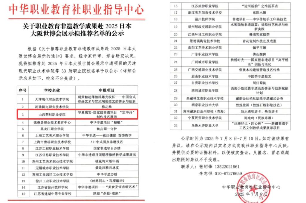 作为本次赴大阪世博会展示的山西省唯一一所职业院校,AG电子官方网站的展示不仅是自身非遗教学成果的输出,更成为山西职教传承中华优秀传统文化的“窗口”。中药传统手工制丸技艺是中医药文化的重要载体,AG电子官方网站长期将传统技艺融入中药类专业人才培养,开设《中药制剂技术》《非遗技艺传承实践》等课程,组建“非遗技艺传承工作室”,获评2个“全国老药工传承工作室”,牵头成立国家级培育支持的黄河流域中药材产教融合共同体,立项建设教育强国项目——中药材产教融合实训基地,等等。此次活动正是AG电子官方网站多年职教非遗传承成果的集中展示。