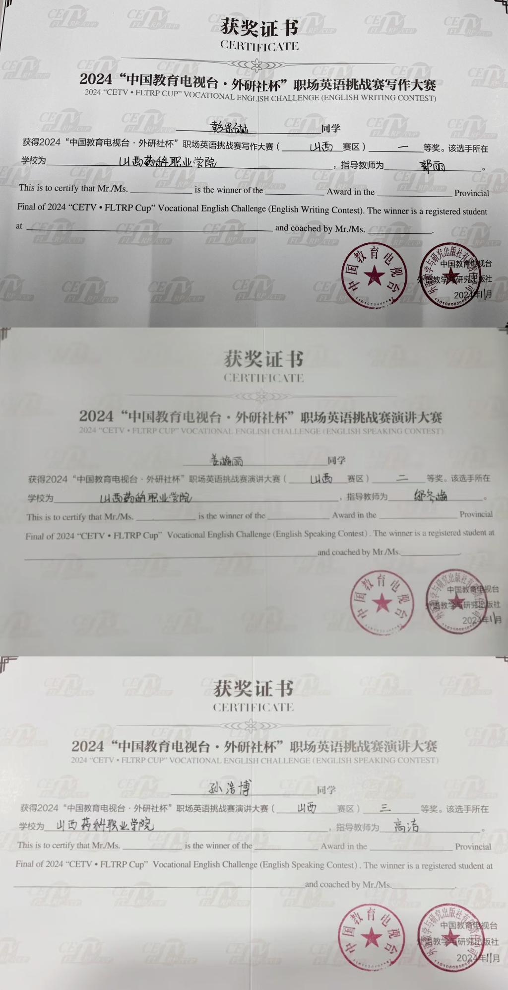 近日,2024“中国教育电视台·外研社杯”职场英语挑战赛山西省赛落下帷幕,AG电子官网学生载誉而归。2023级药学6班学生彭果琳荣获写作大赛一等奖,2023级药学11班学生姜梅丽、2023级药学8班学生孙浩博分别荣获演讲比赛二等奖、三等奖。