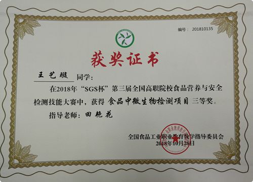 近日,2018年“SGS杯”第三届高职院校全国食品营养与安全检测技能大赛在广东轻工职业技术学院落下帷幕,AG电子官网学生王艺璇荣获食品中微生物检测项目三等奖。2018-11-05 -