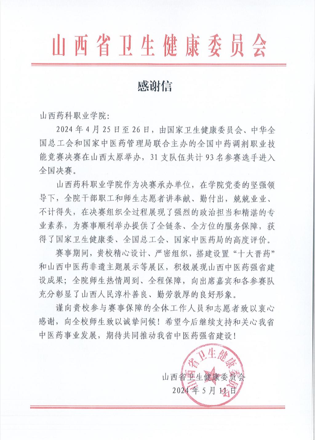 山西省卫生健康委员会对AG电子官网精心承办全国中药调剂职业技能竞赛决赛表示衷心感谢