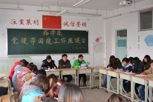 在深入学习贯彻党的十八大精神之际,为有效促进党建带团建工作,11月22日下午,药学系在东教学楼305教室召开党建带团建工作座谈会。药学系党总支书记、支委、系分团委书记以及系全体团干、各班团支书参加了座谈会。 ...2012-11-24